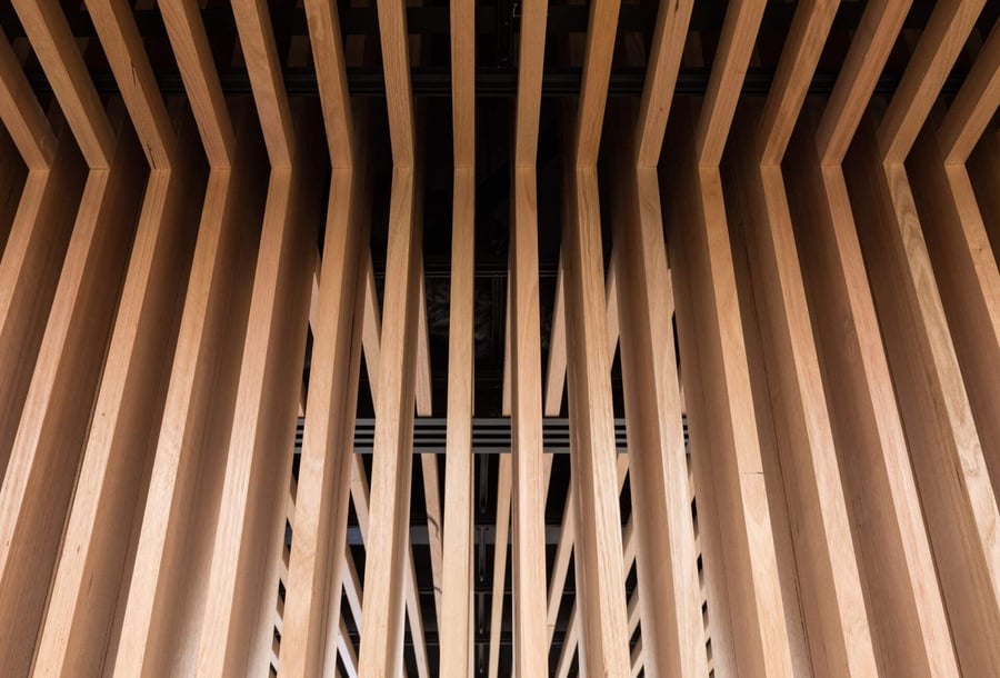 We ensure that the piece of timber from the ceiling (or wall) is steam bent at precisely the right angle to meet up with the corresponding battens. Creating clean linear lines which stay in place.