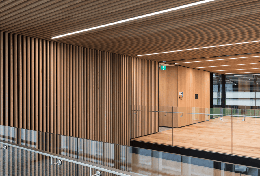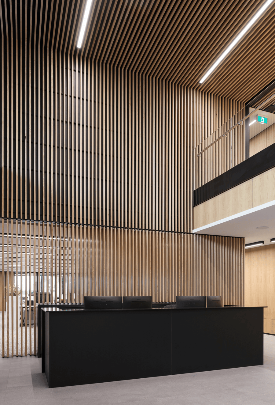 Throughout the foyer of EastCo (pictured), our curved Click-on Battens feature as a transition from the ceiling of the floor below. Crafted from White Oak, the timber is permeable and able to be curved to hug the interior.